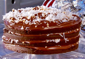 Scrumptious chocolate coconut cake made from desicated coconut, cocoa, margarine and milk.