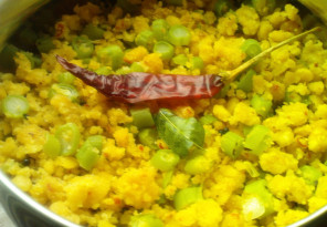 - Heat oil in a shallow pan, temper with mustard seeds, red chillies, urad dal and curry leaves.