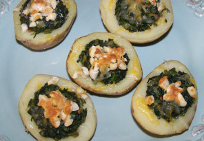 - Fill the mixture into the potatoes, cover with the potato lids and secure with wooden cocktail sticks (toothpicks).